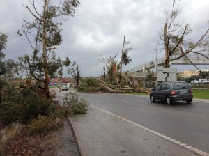 En plotseling was daar onze duitse buurman die in zijn 4WD voorop reed en ons uit de penarie zou halen mochten we wegdrijven. Ons kleine huurautootje was een soort bootje maar heeft ons veilig naar de hoger gelegen weg gebracht. Toen we de ravage bij de supermarkt ontdekten schrokken we ontzettend…….we zagen uitgerukte bomen, ingestorte daken en autos die van de weg af waren geslingerd. Pas later realiseerden we ons dat we enorm veel geluk hadden gehad. Het is verdrietig om te horen dat andere mensen hard zijn getroffen.