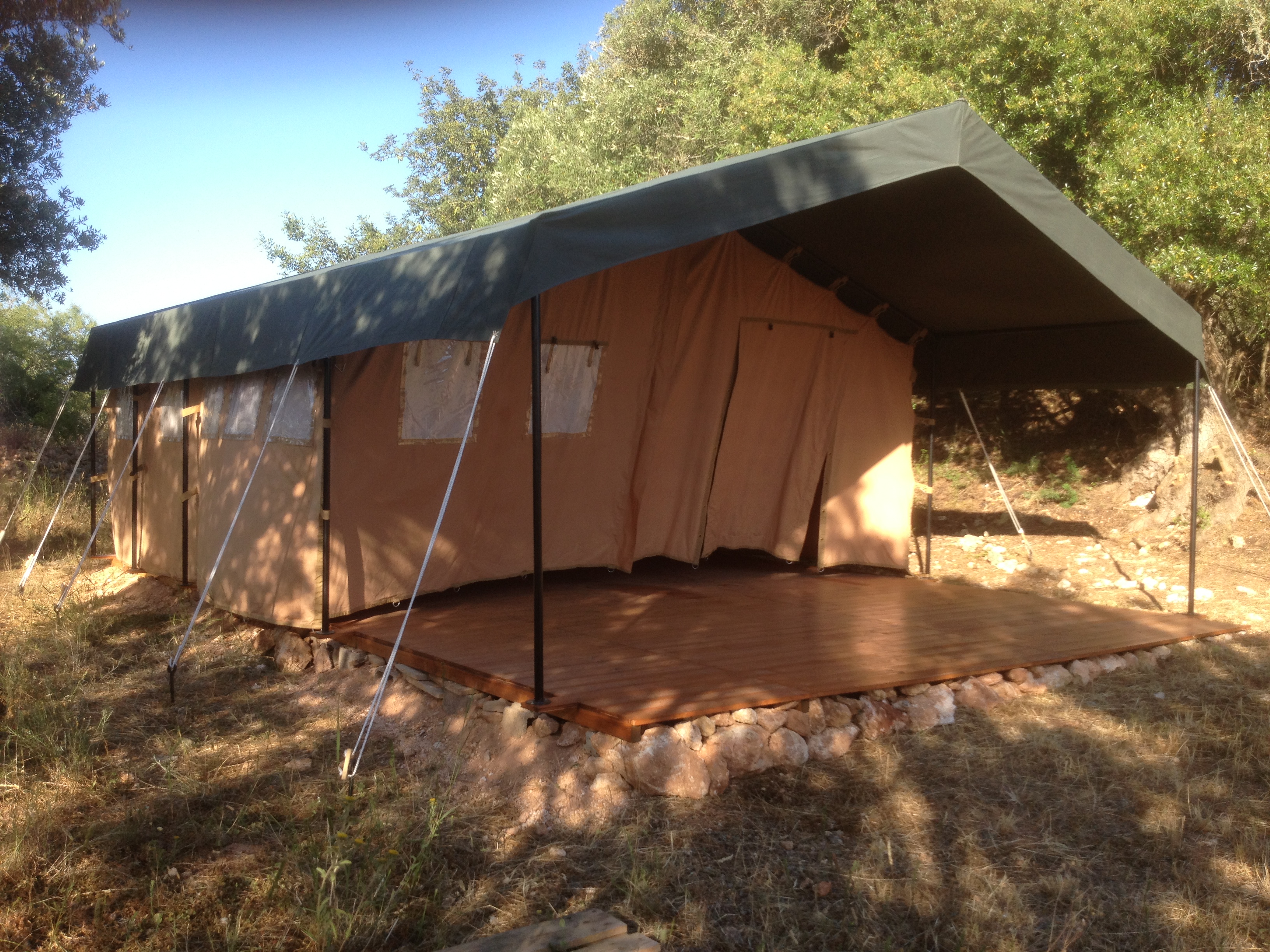 Om dicht bij de bouw te zijn vertoeven we nu regelmatig in onze mooie safaritent die we hebben opgezet op het land. Het was even flink aanpakken met z’n 3en om de houten vloer keurig op maat te timmeren en het zware tentdoek omhoog te hijsen, maar het is gelukt, met dank aan Nelly onze dierbare vriendin.