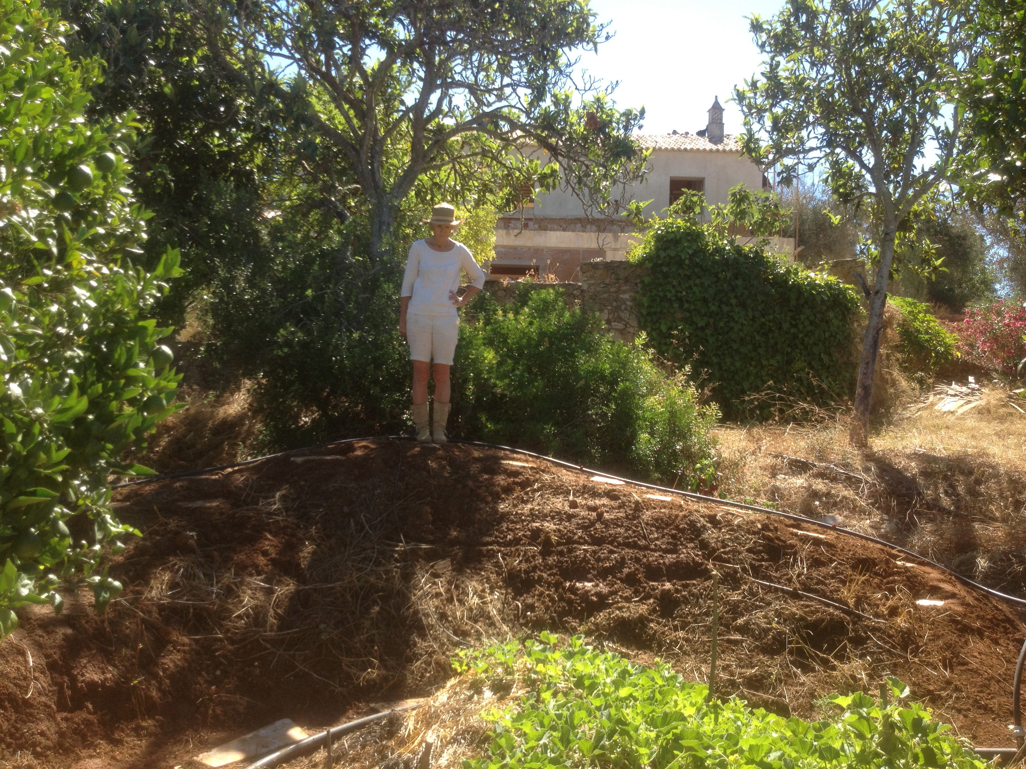 De beste tijd qua temperatuur om op het land werkzaamheden uit te voeren blijkt toch wel de ochtend te zijn. Dus gaan we met zonsondergang naar bed en zijn we bij het eerste daglicht te vinden in de boomgaard. Vlakbij de twee heuvelbedden met pompoenen, meloenen, aardbeien en kruiden, hebben we een derde “bed” gemaakt dat nu klaar is. Wederom een flink aantal lagen met karton, compost, stro en paardenmest gaan ervoor zorgen dat op de lange termijn hier weer een vruchtbaar stukje land ontstaat met een behoorlijk hoogteverschil. Dat laatste is dan weer een handig voordeeltje om bukken te voorkomen bij het oogsten van groente en fruit. Nieuwe tomatenplanten, paprika en groene- en rode kool doen inmiddels hun best om te groeien op dit zonnige plekje voorzien van een flinke irrigatieslang voor het broodnodige water.